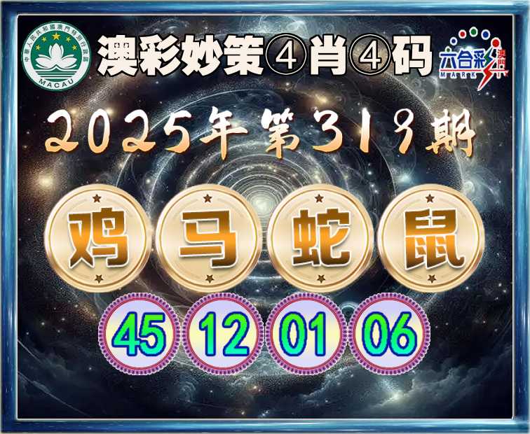 319期:【澳彩妙策】 ④肖④码【鸡马蛇鼠】【45.12.01.06】开:鸡45准