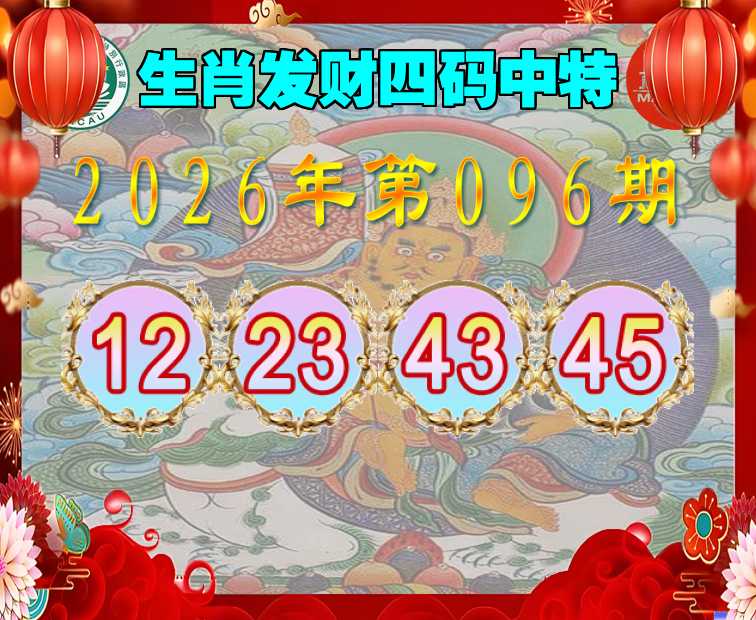 096期:『生肖发财』 四码中特【12.23.43.45】开:43