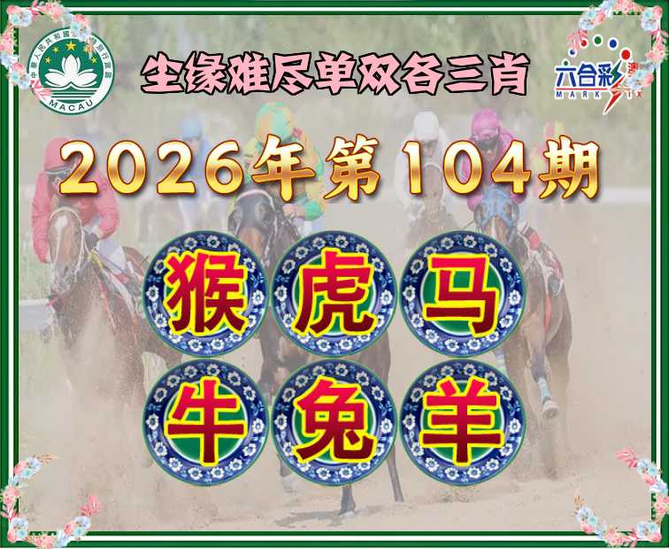 104期: 尘缘难尽 单双各三肖【猴.虎..牛.兔.羊】开:马01
